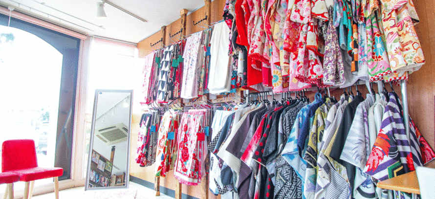 七五三の衣装がたくさん並んでいます。広々とした開放的なスペースでの衣装合わせ。